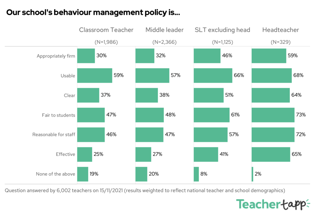 The data above from Teachertapp shows just how out of touch leaders can be, in this case in relation to the views of teachers on the ground. We have to be careful with this data because the headteachers and senior/middle leaders surveyed will not be all in the same schools as the teachers who responded, so it is not revealing specific in-school gaps in perception. However, the overall impression is that headteachers have a far rosier view of the firmness, clarity, fairness, usability and effectiveness of their behaviour management policies than teachers do!